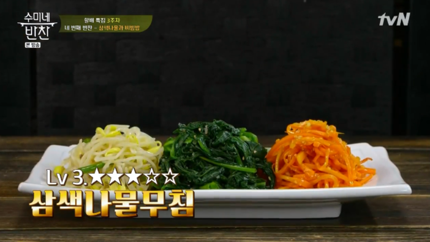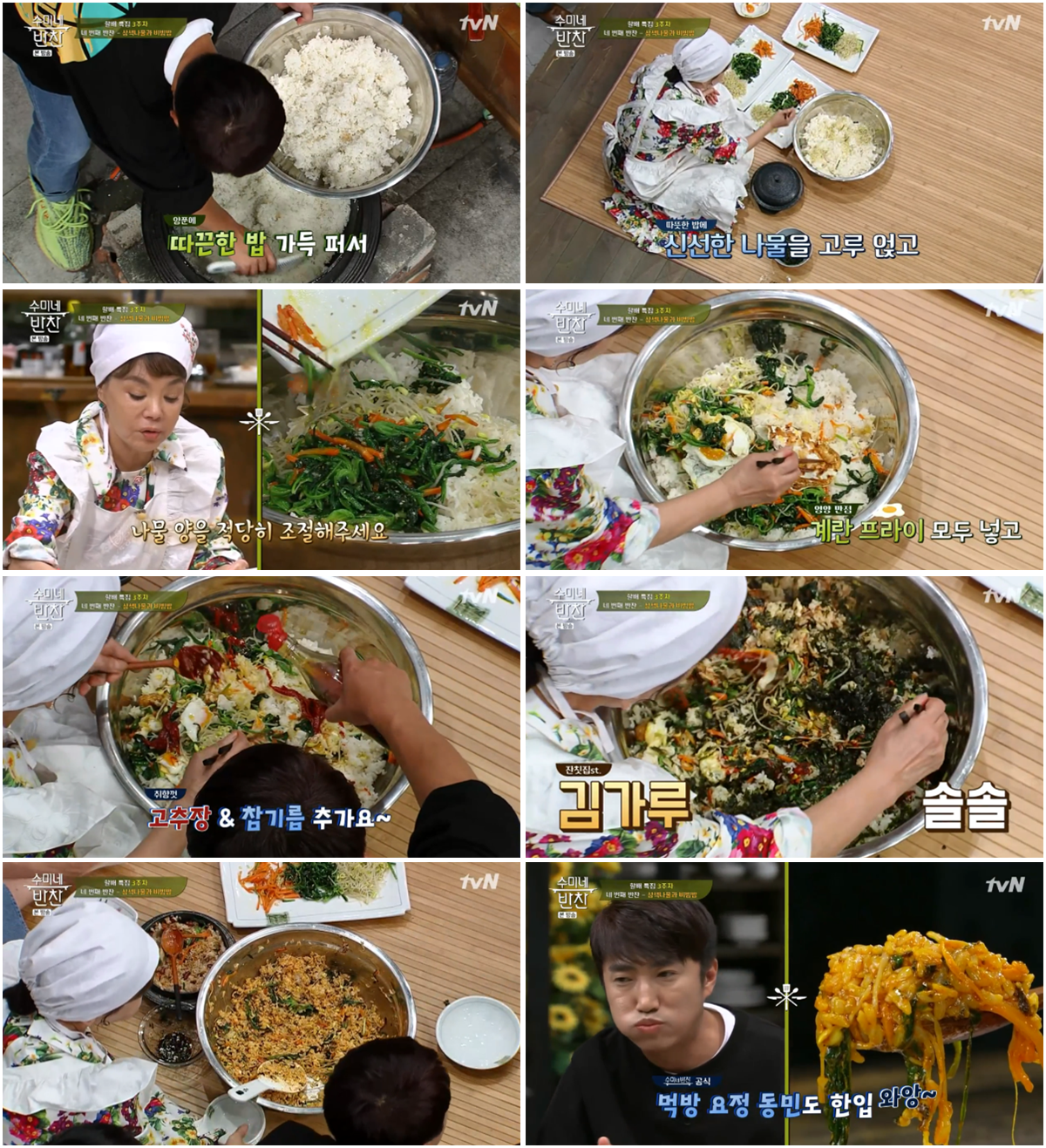 이렇게 만든 삼색나물을 이용해 김수미 선생님께서는 뜨거운 밥에 갓 만든 신선한 나물을 적당량 넣고