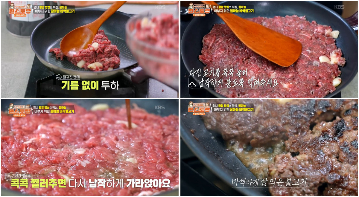 (고기가 익을 때 빠져나온 수분을 빼주면 고기가 더 잘 익습니다.)
