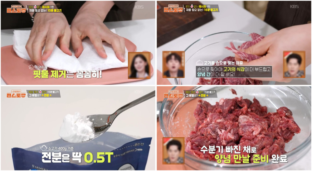 (고기에 전분을 넣고 버무리면 잡내 제거와 함께 전분이 보호막을 형성해 고기가 질겨지지 않고 부드러워지며, 양념이 잘 달라붙게 전분이 고기의 수분을 빨아들입니다.