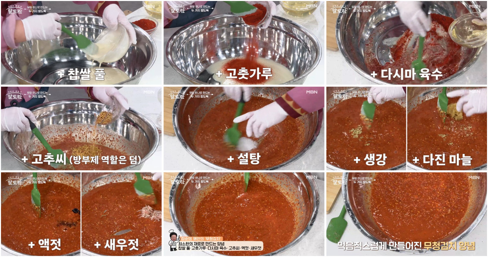 양념 재료: 찹쌀 풀, 고춧가루, 다시마 육수, 고추씨, 설탕, 생강, 다진 마늘, 액젓, 새우젓