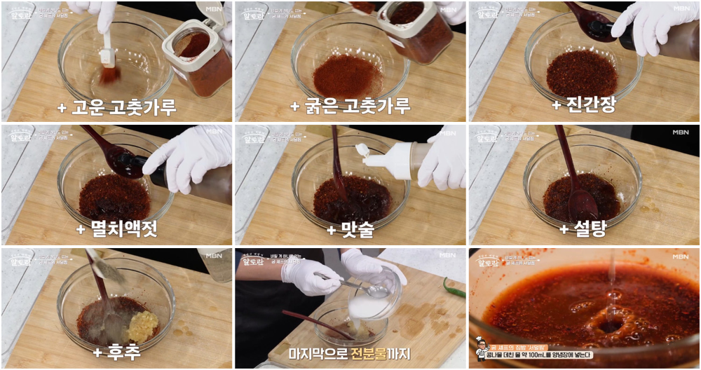 양념 재료: 고운 고춧가루, 굵은 고춧가루, 진간장, 멸치액젓, 맛술, 설탕, 다진 마늘, 후추, 전분물, 참기름, 통깨