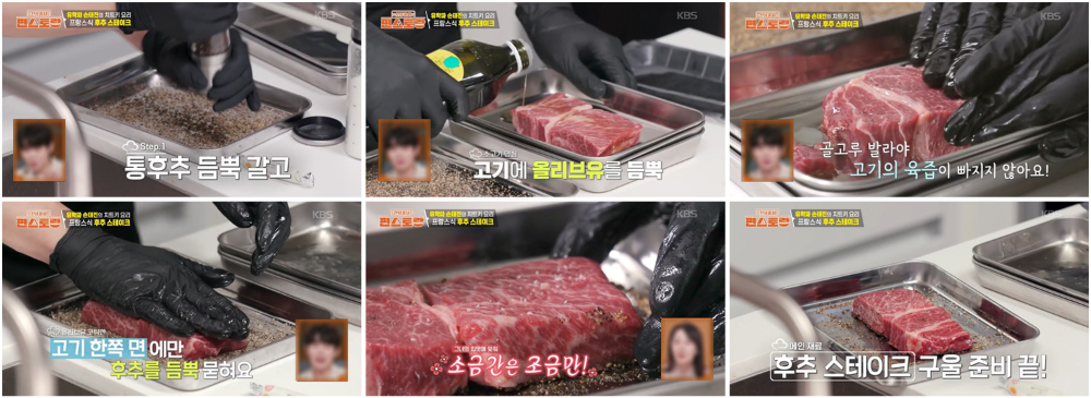(고기에 후추를 묻히면 겉은 바삭하게 구워지고 속은 수분 증발을 막아 촉촉하게 익힐 수 있으며, 후추 향이 스며들어 고기 잡내 제거에도 도움을 줍니다.)