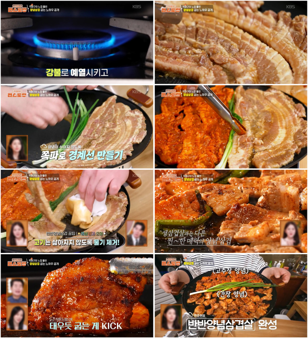 307회 신상출시 편스토랑에서 김준현은 삼겹살에 달달 짭조름한 간장양념과 맵고 달달한 고추장양념을 각각 더해 2가지맛의 삼겹살을 즐길 수 있는 반반양념삼겹살 만드는 법을 공개했는데요.