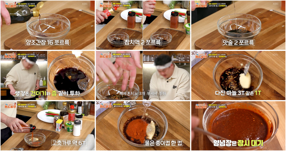 양념 재료: 양조간장 16쪼르륵, 참치액 2쪼르륵, 맛술 2쪼르륵, 설탕 1큰술, 고춧가루 6큰술, 다진 생강 1/2큰술, 다진 마늘 3큰술, 페페론치노 3개, 순후추, 물 200ml