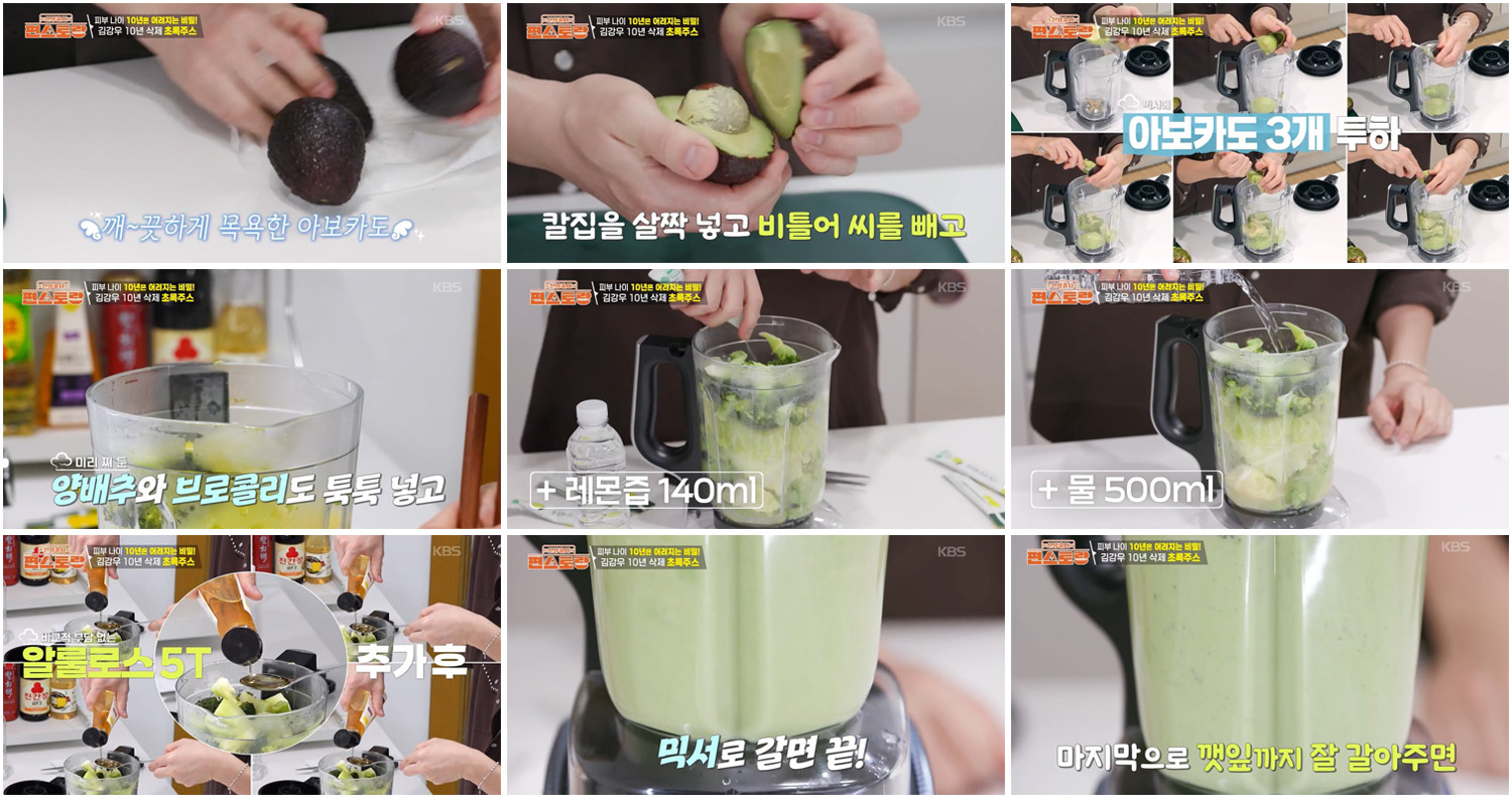 312회 신상출시 편스토랑에서 김강우는 피부 나이 10년을 되돌려주고 채소로 만들었는데 키위주스 맛이 나는 초록삭제주스 만드는 법을 공개했는데요.