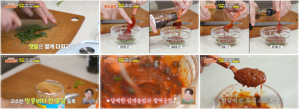 닭갈비 스타일의 특제 소스 재료: 깻잎 6장, 매실청 2큰술, 고추장 2큰술, 참기름 2큰술, 맛술 1큰술 , 땅콩버터 1큰술